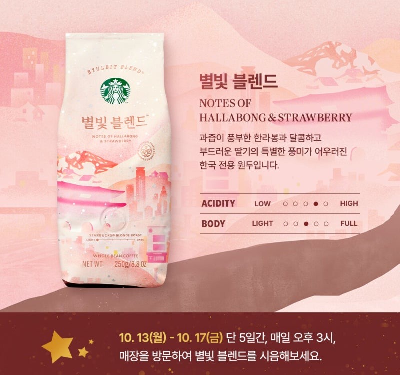 発売を記念して、10月13日~10月17日まで限定で毎日午後3時から韓国国内スターバックス全店舗で、「星明りブレンド」で抽出したドリップコーヒーの試飲イベント「コーヒーモーメント」が開催されます!