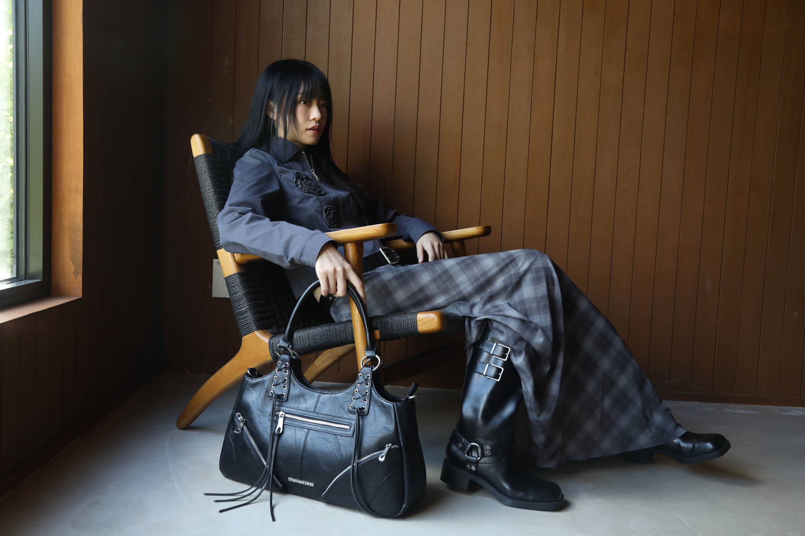 ブラックのレザーバッグをメインに展開するほか、アパレルやスカーフなどの小物も販売しています。