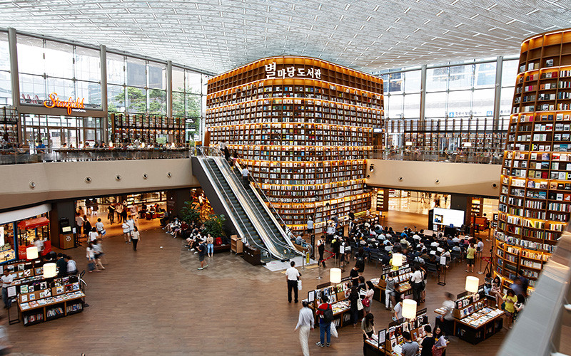 韓国・ソウル旅行について調べていると、今ではよく目にするスポットのひとつが「ビョルマダン図書館(별마당 도서관)」です。